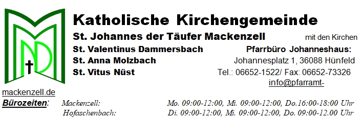 Messintentionen oder Beiträge für den nächsten Pfarrbrief können Sie bis zum 10.12.2018 im Pfarrbüro persönlich, telefonisch zu den Bürozeiten oder per Mail abgeben. Sie können den Inhalt der Gottesdienstordnung mit aktuellen Beiträgen und Informationen auch online unter www.mackenzell.de oder www.molzbach.de einsehen. Weitere Beiträge finden Sie bei Facebook und Youtube unter Pfarrei Mackenzell.